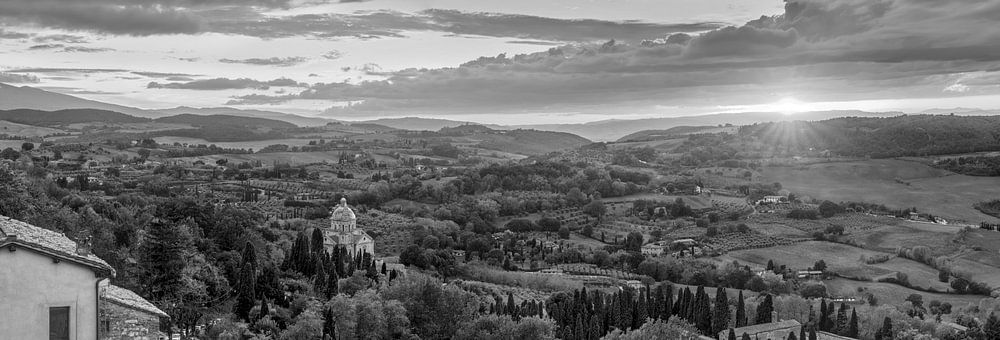 Die letzten Sonnenstrahlen streifen die Stadt Montepulciano in der Toskana.