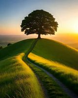 Die idyllische ländliche Landschaft entfaltet sich auf einem sanft geschwungenen Hügel, wo ein einzelner Baum majestätisch in der Morgensonne steht. Der Baum, mit seiner weit ausladenden Krone, ist ein Symbol der Ruhe, seine Äste wiegen sich sanft im leichten Morgenwind. Die Wiese, bedeckt mit einer dezenten Schicht frischem Tau,…