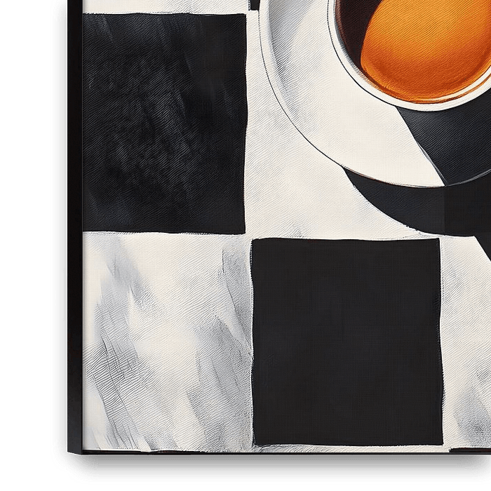 In diesem Kunstwerk wird der Morgenkaffee in einer Mischung aus Vintage-Farbtönen zum Leben erweckt, die sich wunderbar vermischen und eine warme Atmosphäre hervorrufen.