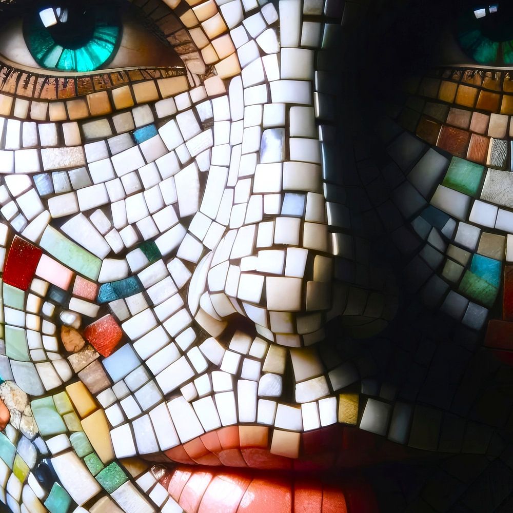 Jede Fliese ist sorgfältig platziert, um lebensechte Gesichtszüge zu formen – durchdringende blaue Augen, sanfte Lippen und ausdrucksstarke Konturen von Wangen und Stirn.