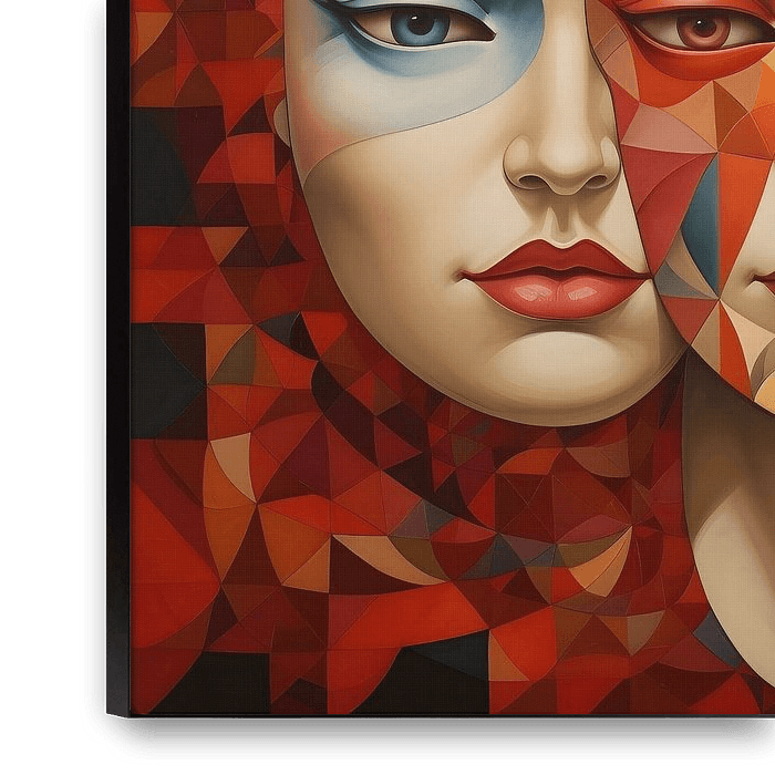Dieses Kunstwerk ist ein geometrischer Tanz der Farben und Formen. Jedes Gesicht ist mit einer Palette gemalt, die von warm bis kühl reicht und das Spektrum der menschlichen Gefühle symbolisiert. Die Gesichter sind ineinander verschlungen, was auf die Komplexität und Verflechtung unserer Identitäten hinweist, wobei jeder Winkel einen…