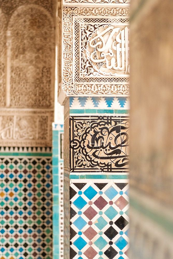 Dieses Bild zeigt die beeindruckenden Mosaike an den Wänden einer Koranschule in der Medina von Fes. Jedes Kachelstück wurde sorgfältig platziert und bildet ein wunderschönes Muster, das dem Raum sowohl Farbe als auch Tiefe verleiht. Die feinen Details und symmetrischen Muster sind nicht nur eine Augenweide, sondern spiegeln auch die reiche Tradition der marokkanischen Kunst und des Handwerks wider. Die Mosaike sind mehr als nur Dekoration; sie erzählen eine Geschichte von Religion und Kultur. Es war eine einzigartige Erfahrung, diese für die Medina von Fes so charakteristische Schönheit einzufangen.
