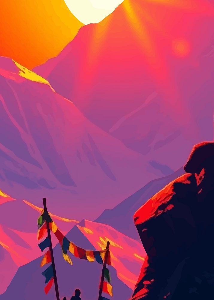 Eine atemberaubende Illustration des Mount Everest bei Sonnenuntergang, wobei der hoch aufragende Gipfel in warme goldene und rosa Farbtöne getaucht ist. Der Himmel wechselt von tiefen Orangetönen zu Violett, wenn die Sonne hinter dem Horizont verschwindet. Schneebedeckte Hänge reflektieren das weiche Licht und schaffen eine ruhige und majestätische Atmosphäre. Im Vordergrund vermitteln zerklüftete Felsen und verstreuter Schnee ein Gefühl von Größe, während sich die weite, ruhige Landschaft ausdehnt und ein Gefühl von Ehrfurcht und Ruhe hervorruft.