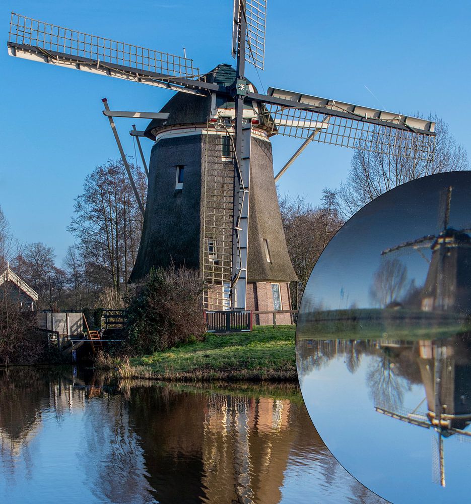 Die Amsterdamer Poldermühle De 1100 Roe ist ein sogenannter Bodensegler und stammt wahrscheinlich aus dem Jahr 1674. Die Mühle ist in Amsterdam-Osdorp zu finden. Das fast faltenfreie Wasser spiegelt die jahrhundertealte Mühle mit ihren Segeln wider.