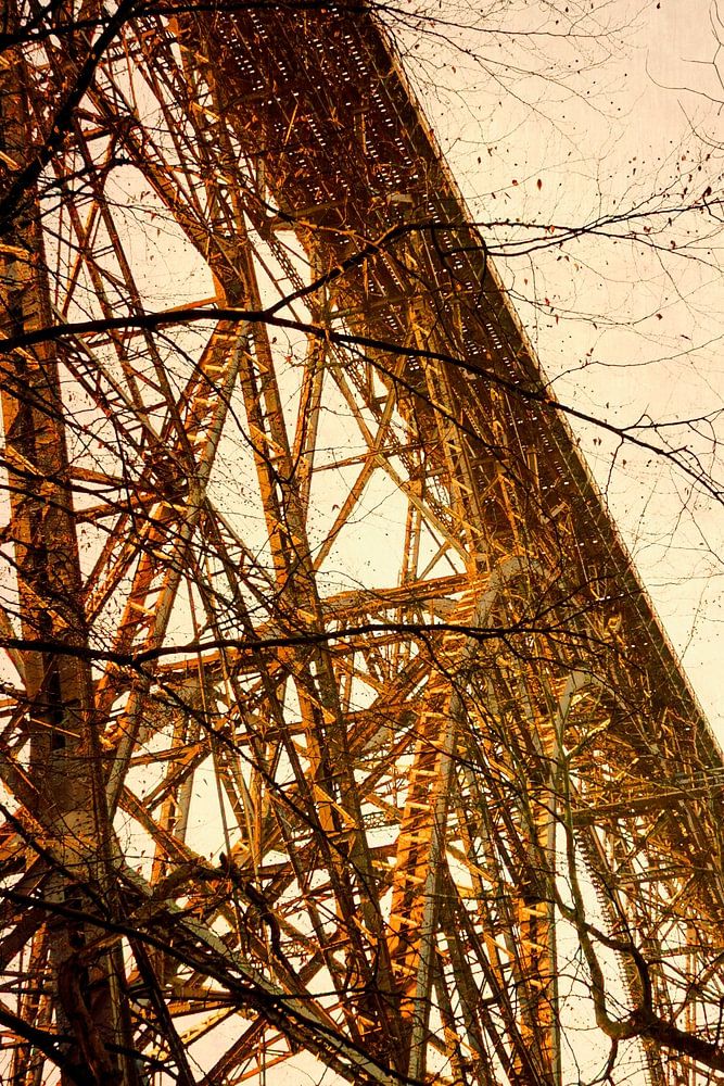 Blick auf die Müngstener Brücke aus der Froschperspektive an einem sonnigen Dezembermorgen. Das Licht taucht die Brücke in warme gelb-orange Töne. Zweige von Laub befreiten Bäumen bilden einen natürlichen Rahmen.