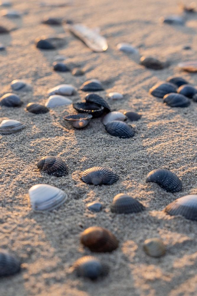 Muscheln am Strand von Terschelling, was für ein schöner Anblick so mit den Farben des Sonnenuntergangs huh?