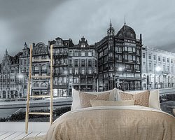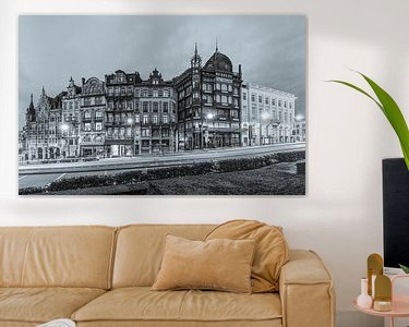 Schwarzweißfotografie Historische Häuserreihe mit dem Musikinstrumentenmuseum mim, dem Musée des instruments de musique, am Mont des Arts in Brüssel bei Nacht, Belgien