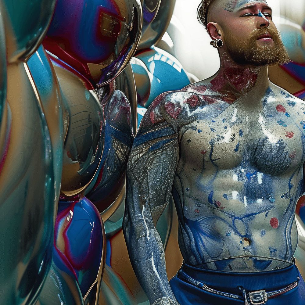 Diese von der künstlichen Intelligenz geschaffenen Porträts muskulöser Männer in einer fließenden Umgebung sind ein Meisterwerk der Ästhetik und der Emotionen, eine Einladung, sich in den grenzenlosen Möglichkeiten der Kunst und der menschlichen Fantasie zu verlieren. Sie zeigen uns, dass wahre Schönheit nicht nur in festen Formen existiert, sondern auch in der Fluidität unserer Wünsche und Träume.