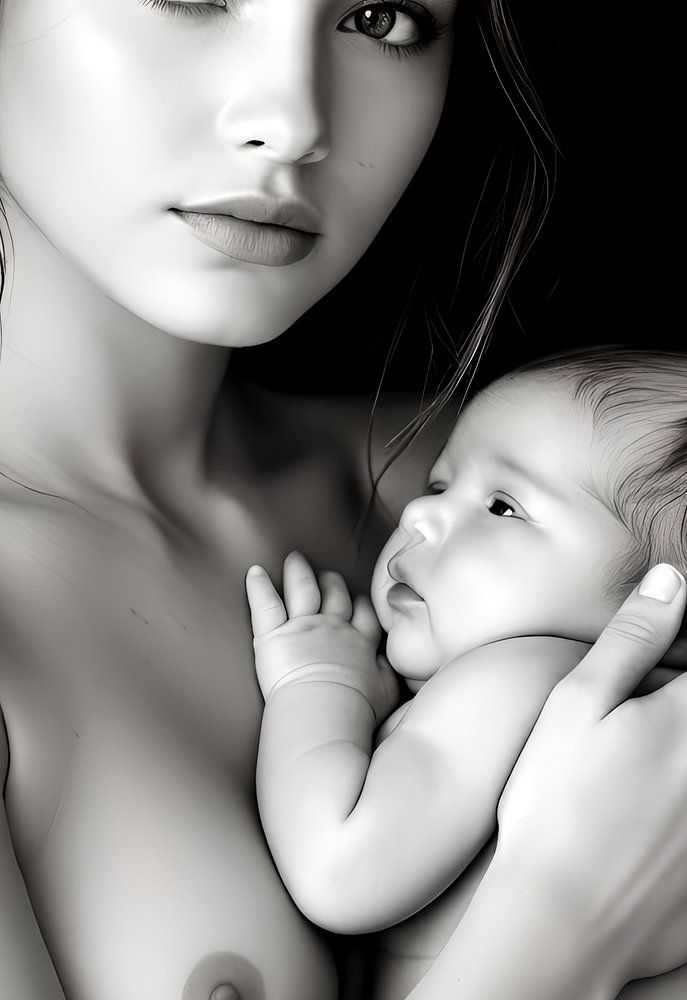 fotografische Darstellung einer fiktiven Mutter mit Kind in Schwarz-Weiß mit dramatischer Beleuchtung im Fotostudio