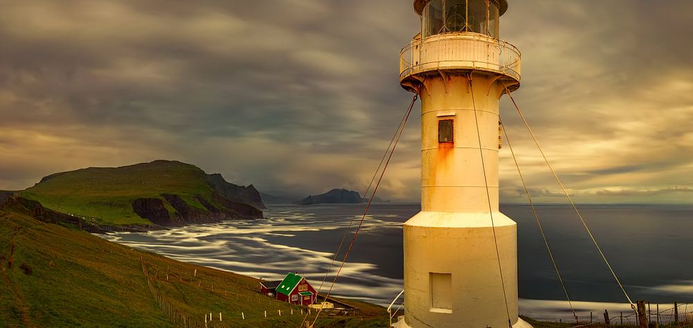 Panorama of Mykinesholmur island and lighthouse in sunset light, Faroe Islands