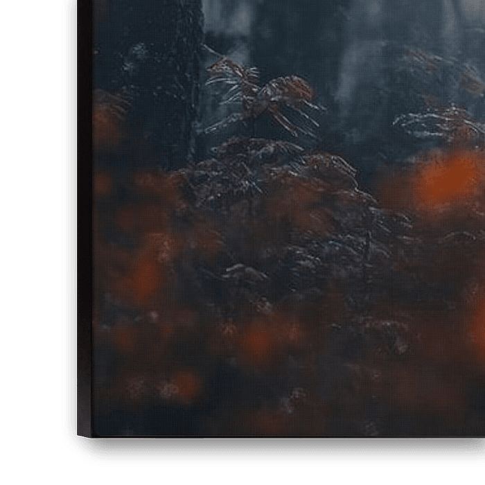 In einer dunklen, fast mystischen Waldumgebung steht dieses Reh umgeben von orangefarbenen Herbstblättern. Die Atmosphäre ist intensiv und erweckt ein Gefühl von Geheimnis. Der Kontrast zwischen dem dunklen Hintergrund und den warmen Farbtönen der Blätter macht dieses Bild einzigartig und auffällig. Dieses Kunstwerk an der Wand verleiht Ihrem Interieur einen Hauch von Geheimnis und Tiefe, ideal für Liebhaber dramatischer, naturnaher Fotografie.