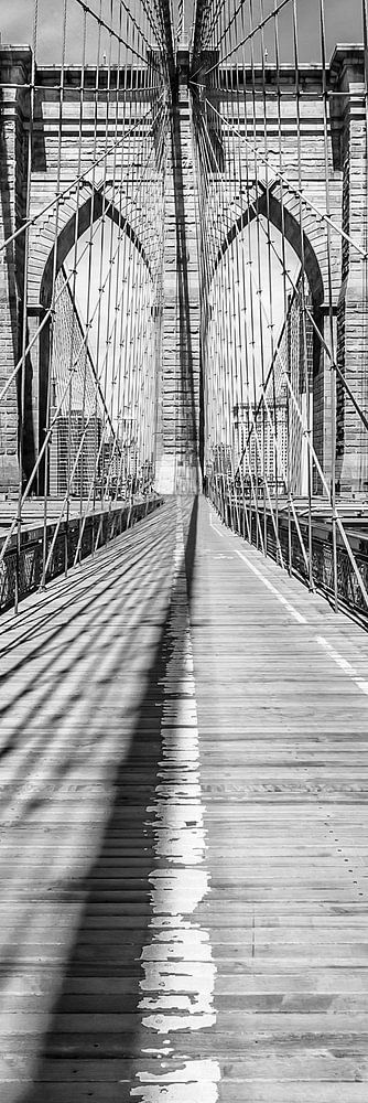 Die Brooklyn Bridge in New York City ist eine der ältesten Hängebrücken in den USA. Sie überspannt den East River und verbindet die Stadtteile Manhattan und Brooklyn miteinander. Hier sind die massiven Stahlseile zu sehen. Dekorative schwarz-weiße Architekturaufnahme im Panoramaformat. Eine klassische Ansicht von der Brooklyn Bridge aus New York City.