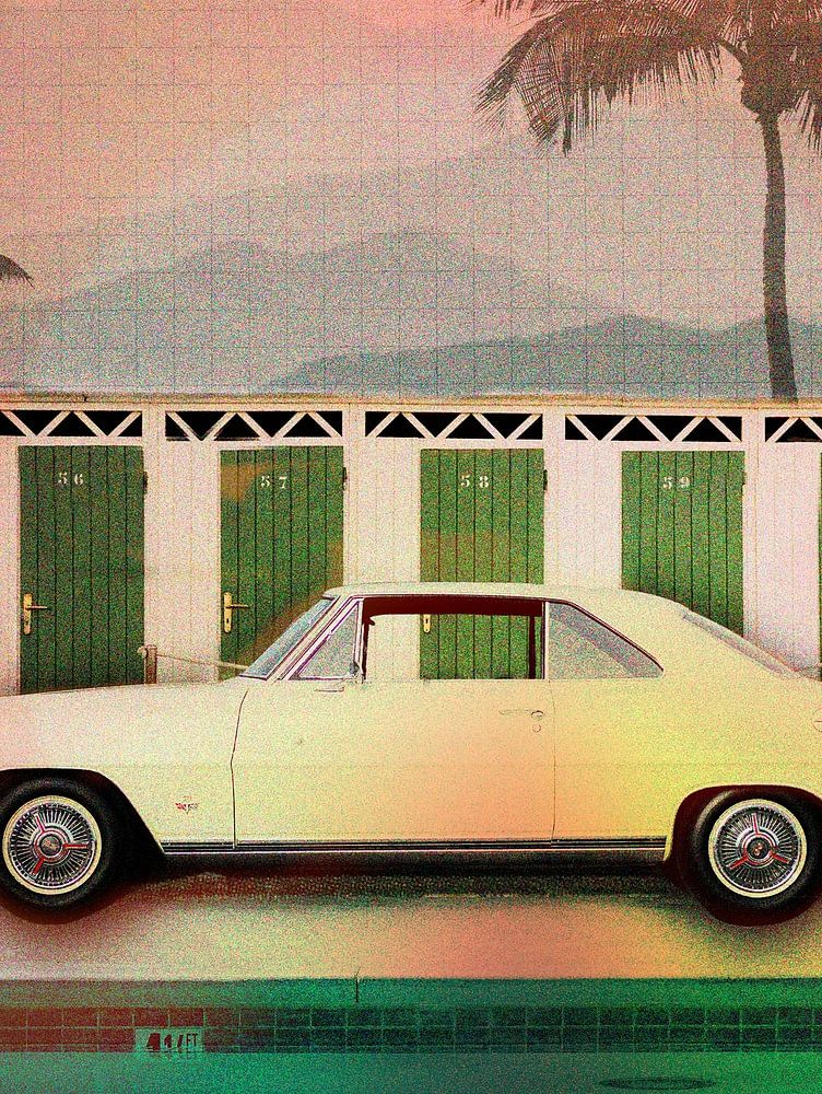 Ein klassisches weißes Auto steht vor einer Reihe von Umkleidekabinen am Rande eines Schwimmbads geparkt, als hätte der Fahrer gerade angehalten, um eine Nacht unter den Palmen zu verbringen. Im Vordergrund reflektiert ein leerer Pool das sanfte Licht der untergehenden Sonne – eine Szene, die direkt aus einem alten Polaroidfoto zu stammen scheint.