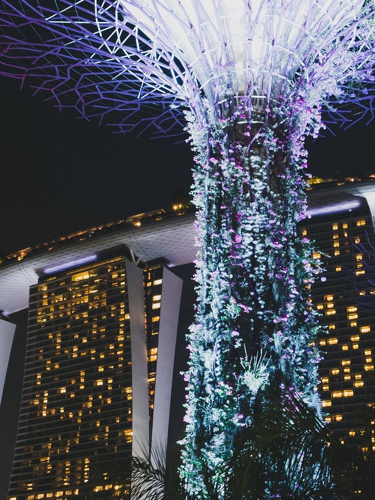 Nachts in Singapur erkennt man, die spektakulär die Stadt wirklich ist. Mysteriöse Lichter und das berühmte Marina-Bay Hotel im Hintergrund.