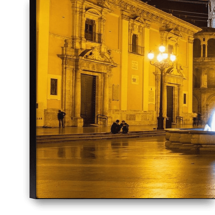 Bestelle das Foto Nachtaufnahme Plaza de la Virgen mit Fuente del Turia in Valencia Spanien von Dieter Walther als Reproduktion auf Leinwand, Alu-Dibond, als Poster, Fototapete oder Acrylglasbild.