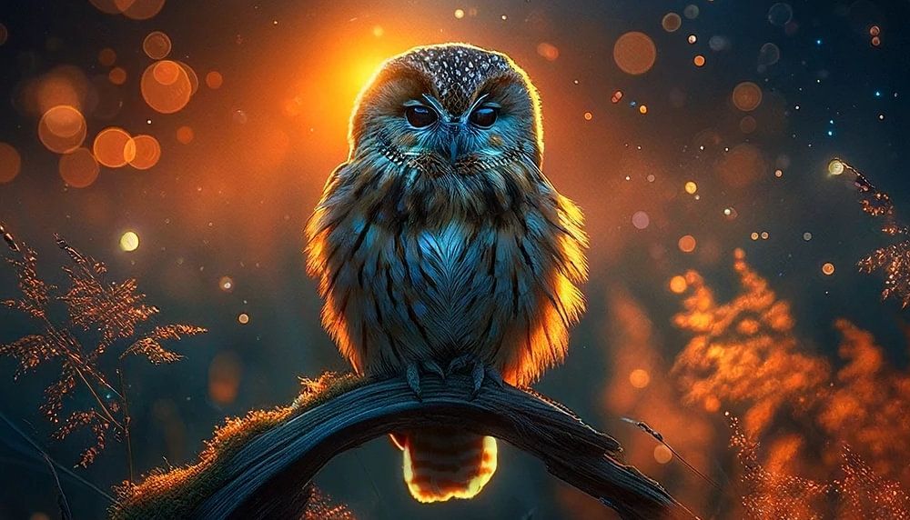 Eine Eule ruht auf einem Ast, während um sie herum die Nacht zum Leben erwacht. Die Dunkelheit wird von einer sanften, warmen Lichtquelle erleuchtet, die jedes Grashalm in ein funkelndes Kunstwerk verwandelt. Das Licht scheint sich im Gefieder der Eule zu spiegeln, wodurch sie aussieht, als wäre sie ein Teil der stillen Musik, die die Nacht spielt. Die Atmosphäre ist magisch, fast unwirklich, als ob man einen kurzen Blick in eine Welt erhascht hat, die normalerweise verborgen bleibt.