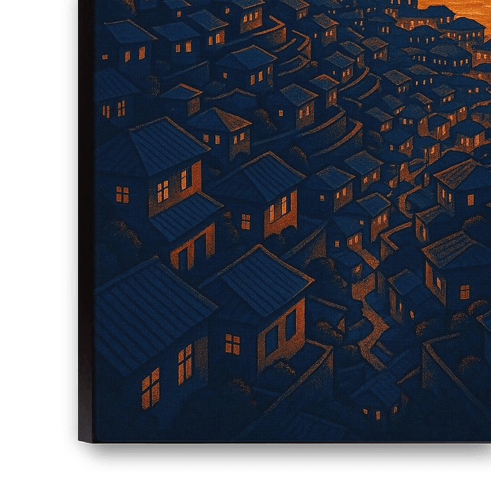 Dieses Kunstwerk fängt die poetische Schönheit von Nagasaki in der Abenddämmerung ein, einer Stadt, in der steile Hänge, leuchtende Fenster und ein schimmernder Hafen eine der stimmungsvollsten Abendlandschaften Japans schaffen. Die Szene entfaltet sich unter einer warmen, untergehenden Sonne, die tiefe Orange- und Goldtöne über das Wasser und die Dächer wirft. Diese Farben gehen nahtlos in das satte Mitternachtsblau über und verleihen dem Kunstwerk einen fesselnden Kontrast, der sowohl nostalgisch als auch dramatisch wirkt.