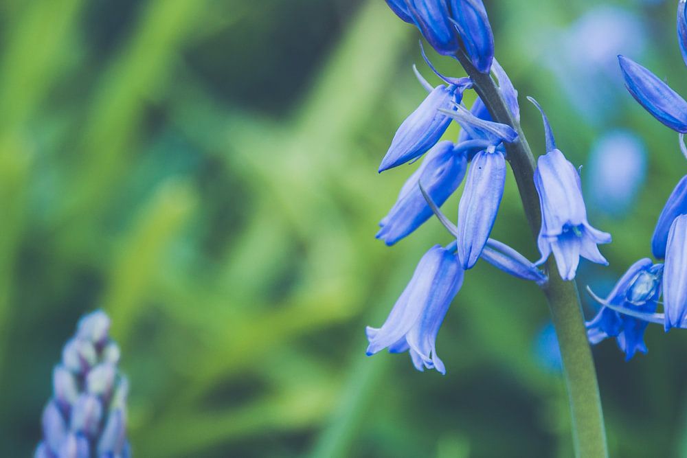 Detailaufnahme mit Weichzeichner von Waldhyazinthen. Diese Boshyazinthe oder wilde Hyazinthe bietet ein schönes, beruhigendes Bild.