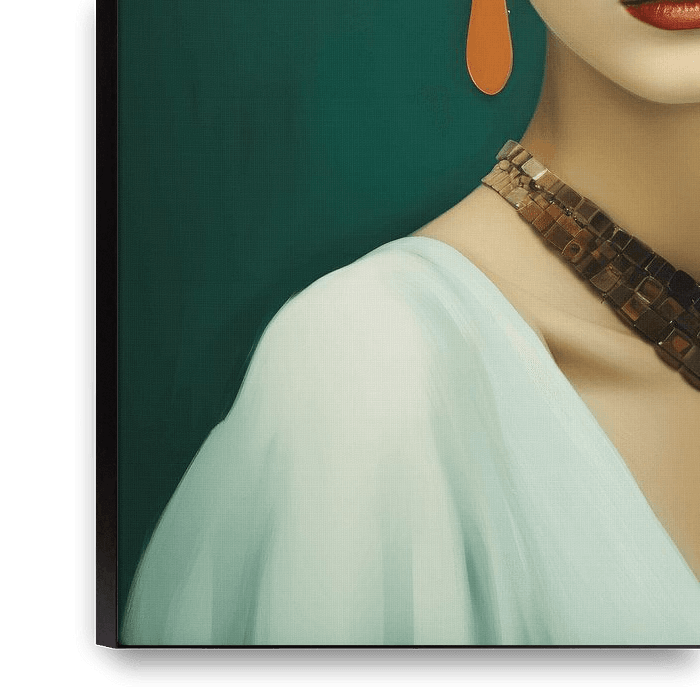 Close-up-Porträt einer jungen Frau mit orangefarbenem Akzent. Wählen Sie die Größe und das Material für diesen Blickfang selbst und passen Sie ihn an Ihre Einrichtung an.