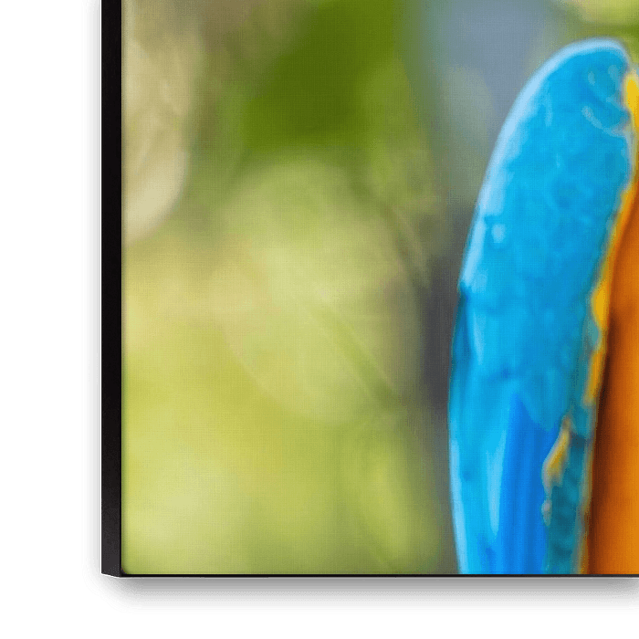 Was siehst du auf dem Kunstwerk? Ein atemberaubendes Nahporträt eines Gelbbrust-Aras (Blue-and-Yellow Macaw). Die Farben sind spektakulär: ein leuchtendes Blau am Kopf und den Flügeln, das in ein tiefes, gesättigtes Gelb am Körper übergeht. Die weißen, federlosen Wangen mit den schwarzen Linien rahmen das Auge perfekt ein. Der mächtige…