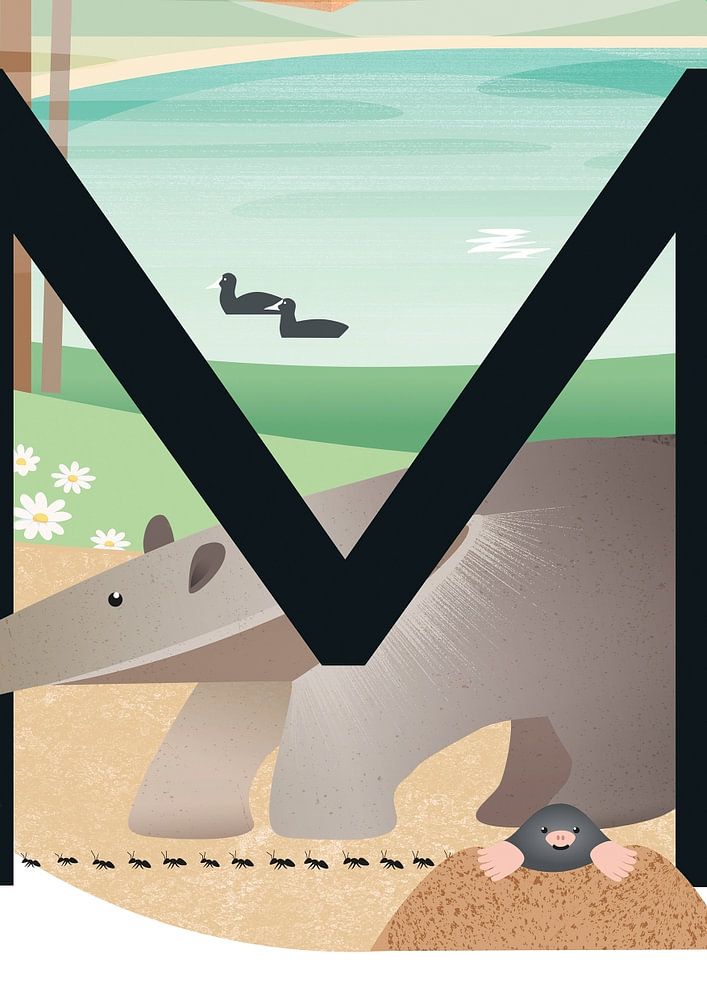 Alles mit M. Finde so viele Wörter mit M. Ein Ameisenbär und ein Maulwurf. Eine Maus und zwei Blässhühner auf dem See. Trotz des Nebels kann man eine ummauerte Mühle erkennen. Und am Himmel steht der Mond. Kannst du auch die Gänseblümchen und die Motte sehen? Fantasiere und erfinde deine eigene Geschichte. Dieses Poster kann auf Wunsch mit einem Namen bestellt werden, zum Beispiel als originelles Geschenk zur Mutterschaft.