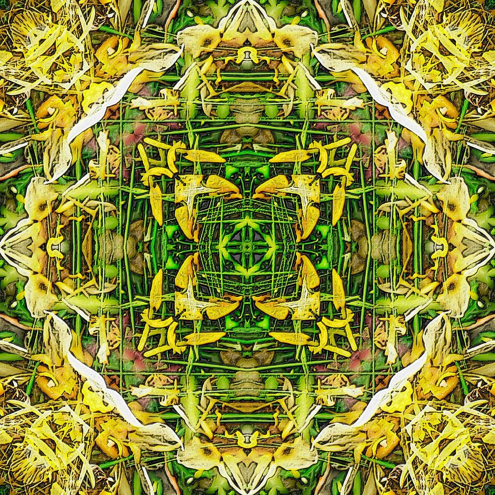 Ein kaleidoskopisches Bild mit vier Quadranten in Schattierungen von hauptsächlich grün und gelb, basierend auf einer Fotografie von Narzissen im Frühling