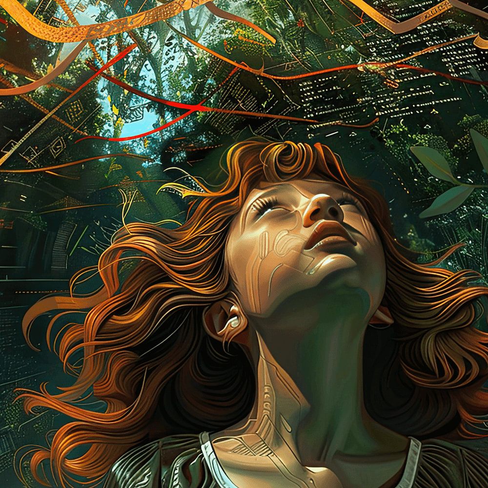 Junge Frau, die in einen Himmel voller Symbole und Daten blickt, die organisch mit den grünen Blättern eines Waldes verwoben sind. Ihr Gesichtsausdruck fängt einen Moment des Staunens und der Erkenntnis ein, als ob er eine tiefere Wahrheit in der natürlichen Welt enthüllt. Die fließenden Daten und die üppige Vegetation suggerieren eine harmonische Koexistenz von Natur und Technologie und laden den Betrachter ein, über die Verflechtung unserer digitalen und physischen Realitäten nachzudenken.