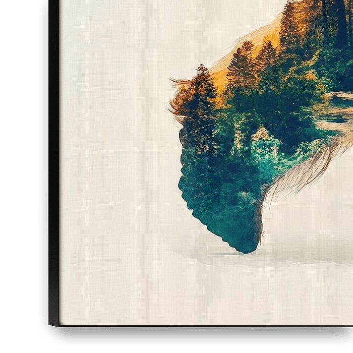 Ein majestätisches Wesen, dessen pelzige Form von einer lebendigen Waldlandschaft durchzogen ist, strahlt eine harmonische Verbindung zwischen Natur und Tier aus. Die sanften Farben und die dynamische Gestalt verleihen dem Raum eine beruhigende Atmosphäre. Perfekt für das Wohnzimmer, bringt es Ruhe und inspiriert zum Träumen.