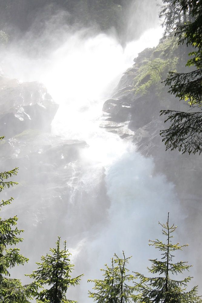 Diese schöne Statue wurde in Österreich geschossen. Es ist ein wunderschöner Punkt, wo man durch die Bäume zu einem großen Wasserfall blickt.