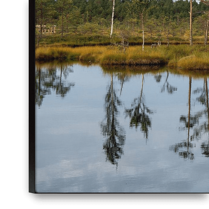 Landschaftsfotografie des Soomaa-Naturparks in Estland. Ein paar nebeneinander stehende Bäume spiegeln sich in einer Wasserpfütze.