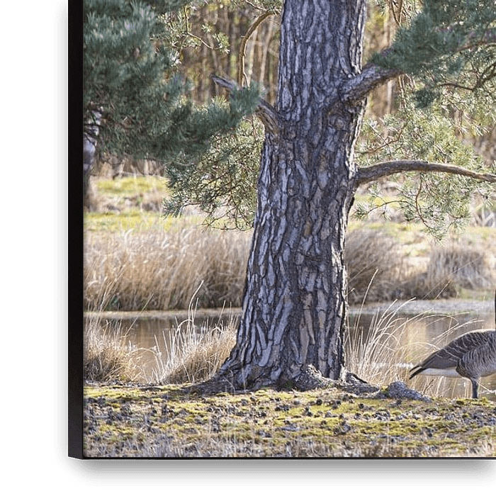 Naturschutzgebiet Kortenhoeff, Gemeinde Woensdrecht. Gänse auf Futtersuche entlang des Wassers unter einer schönen großen Kiefer.