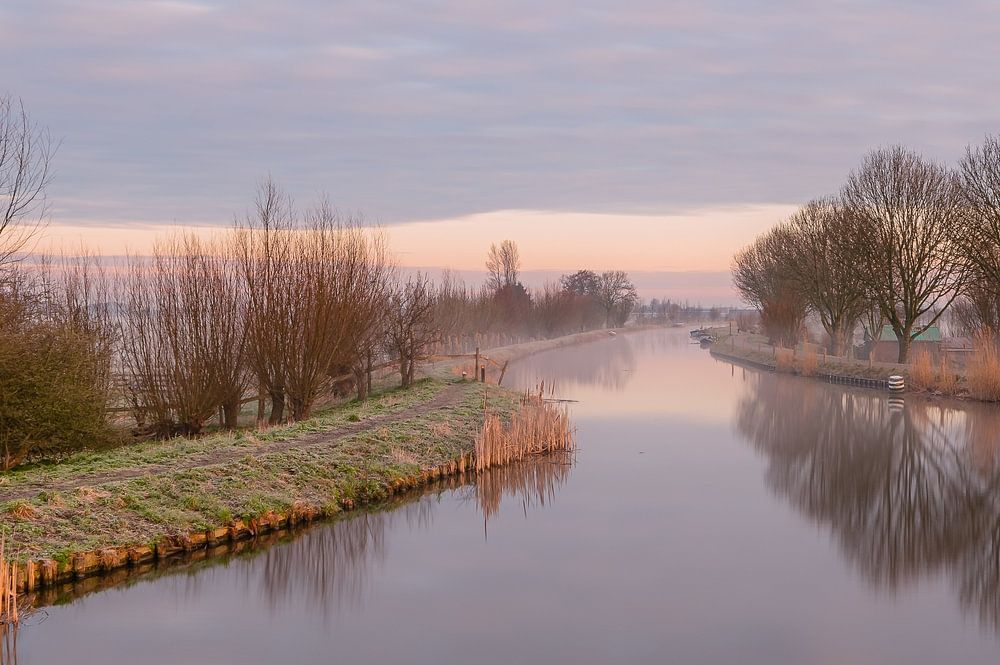 Blick von einer Brücke während eines nebligen Sonnenaufgangs im Polder bei Maasland, Niederlande. Der Duifpolder ist der Name eines Polders und ehemaligen Wasserverbandes in der Gemeinde Midden-Delfland in der niederländischen Provinz Südholland.