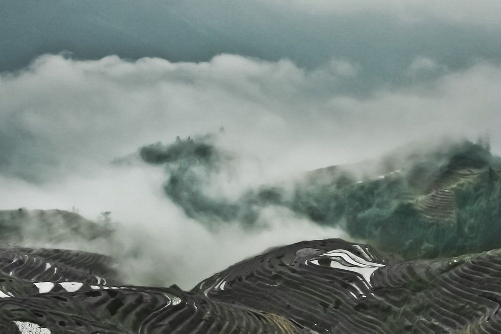Nebliges Panorama. Neblige Herbstlandschaft mit Reisterrassen. China, Yangshuo, Longsheng-Reis-Terrassen.