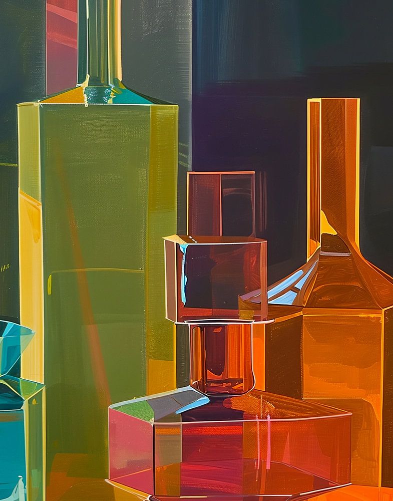 Dieses Kunstwerk vereint Modernität und Fröhlichkeit mit einer abstrakten Darstellung von Glas in funkelndem Licht. Entdecken Sie dieses neonleuchtende Stillleben, ein Fest der Farben, Formen und des Lichts, das jedem Wohnzimmer, jeder Küche und jedem Schlafzimmer ein modernes Flair verleiht!