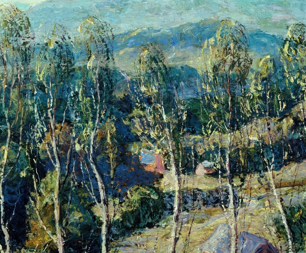 New England Birches von Ernest Lawson ist ein fesselndes Landschaftsgemälde, das die Schönheit der Landschaft zeigt. Das Kunstwerk zeigt eine heitere Szene mit hohen Birken, die stolz vor einer Kulisse aus sanften Hügeln und einem klaren blauen Himmel stehen. Lawsons kräftige Pinselstriche und leuchtende Farben erwecken die Landschaft zum Leben und fangen die Essenz der Region Neuengland ein. Das Spiel von Licht und Schatten verleiht der Komposition Tiefe und Dimension und schafft ein Gefühl von Ruhe und Harmonie.