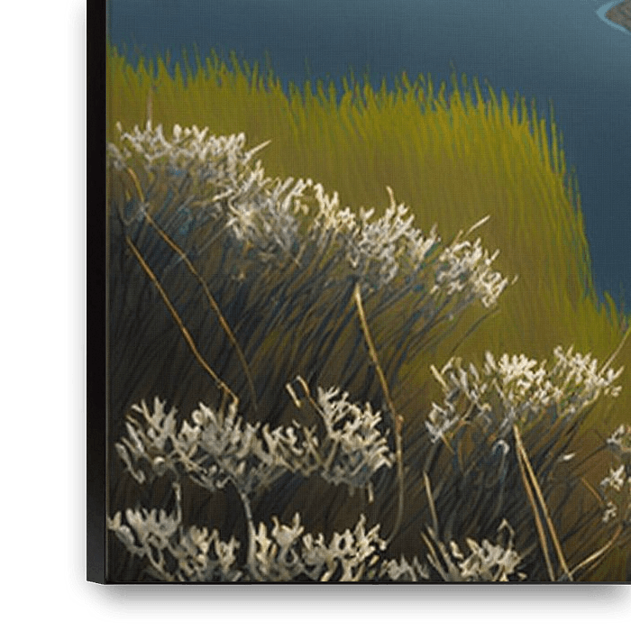 Neuengland-Sumpfgebiete: Dieses atemberaubende digitale Gemälde zeigt die Küstenmarschlandschaften in voller Blüte, mit üppiger Sumpfvegetation und gewundenen Bächen, die sich durch die Landschaft schlängeln. Im Hintergrund sorgen wogende Dünen und kleine, mit dichtem Seegras bewachsene Inseln für Tiefe und Realismus. Dieses in einer…