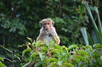 Macaque schaut uns neugierig von seinem sicheren Platz zwischen den Blättern hoch über dem Wasser der Lagune in Sri Lanka an.