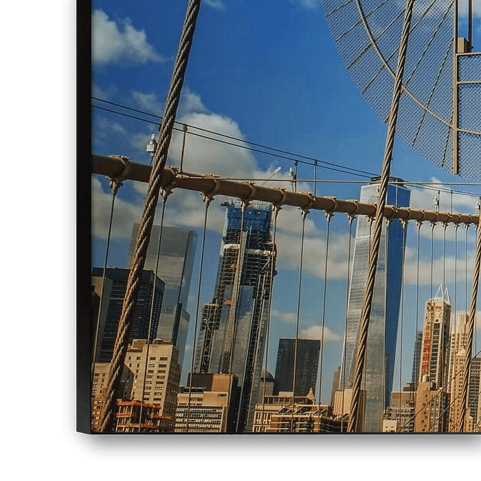 Eines der ikonischen Bauwerke von New York - die Brooklyn Bridge. Durch ihre Hänge- und Schrägseile ein architektonisches Meisterwerk und beliebtes Fotomotiv. Im Hintergrund erkennt man die Skyline von Manhattan.