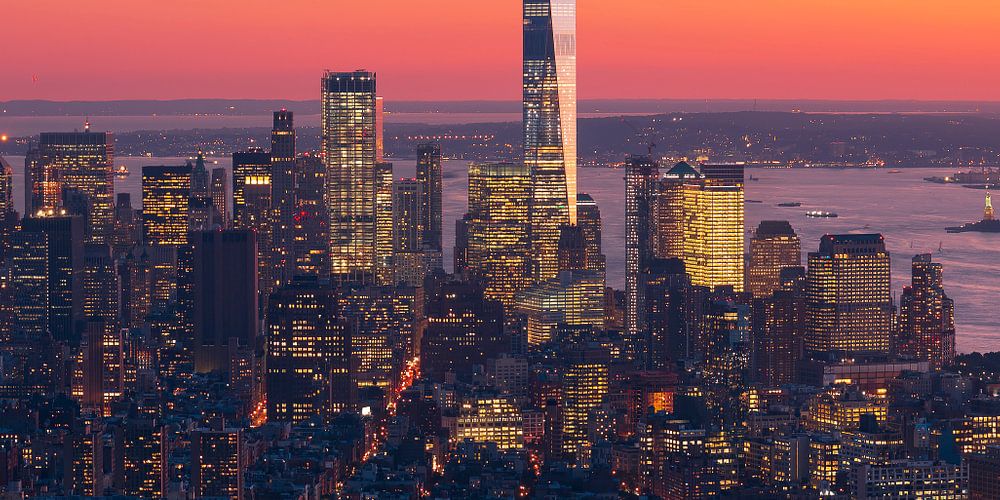 Sonnenuntergang über der Skyline von Downtown Manhattan, mit dem World Trade Center in der Mitte.