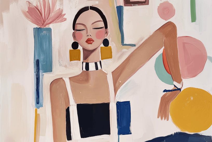 In diesem Werk strahlt die Frau pure Eleganz und furchtlose Ruhe aus. Mit ihren auffälligen gelben Ohrringen, ihrem eleganten schwarzen Oberteil und ihrer lässigen Pose sagt sie: "Ich bin hier, aber ich mache mir keine Sorgen. " Fügen Sie einen geometrischen Hintergrund und eine lässige Haltung hinzu, und Sie haben eine…