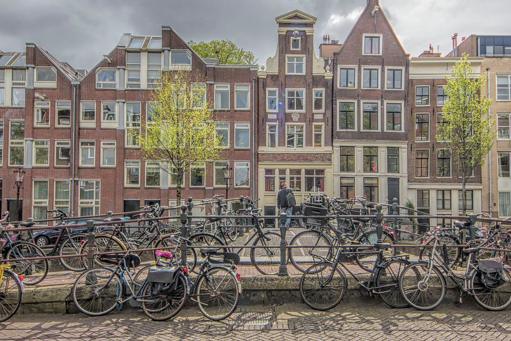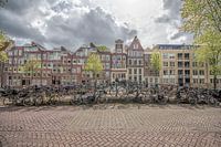 Amsterdam Jede Familie hat mehrere Fahrräder. Dieses Bild zeigt deutlich, was das für die Straße bedeutet. Das Bild zeigt zahlreiche Fahrräder auf der Brücke an der Looiersgracht. Im Hintergrund sind schöne Kanalhäuser, für die Amsterdam berühmt ist.