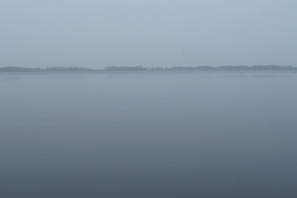 Ruhiger Tag auf den Nieuwkoopse Plassen. Eine minimalistische Landschaft mit ruhigem Wasser zwischen zwei Anlegestellen und einem großen See in Nieuwkoop im Grünen Herzen Hollands.