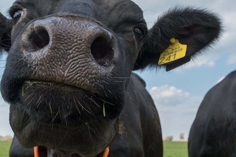 Nieuwsgierige koe wil er graag meer van weten en kijkt recht in de cameralens. Koe in typisch hollands landschap.