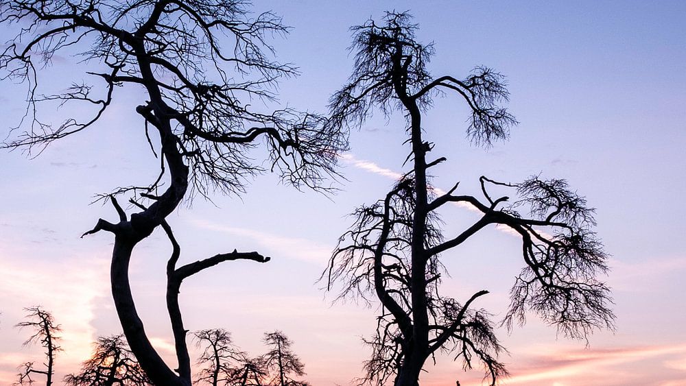 Die toten Bäume von Noir Flohay am frühen Morgen. Kurz nach Sonnenaufgang am Hautes Fagnes
