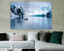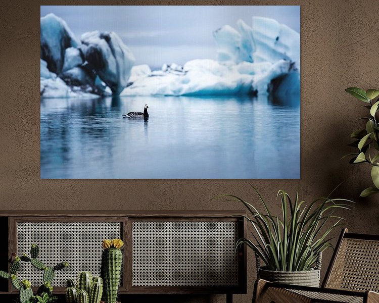 Ich habe dieses Bild von dieser Nonnengans in Island aufgenommen. Der bekannte Gletschersee Jökulsárlón. Sie können die Eisstücke im Hintergrund sehen. Und die blaue Farbe schafft eine kalte Winteratmosphäre. Ein schönes Stück Island-Kunst für Ihre Wand.