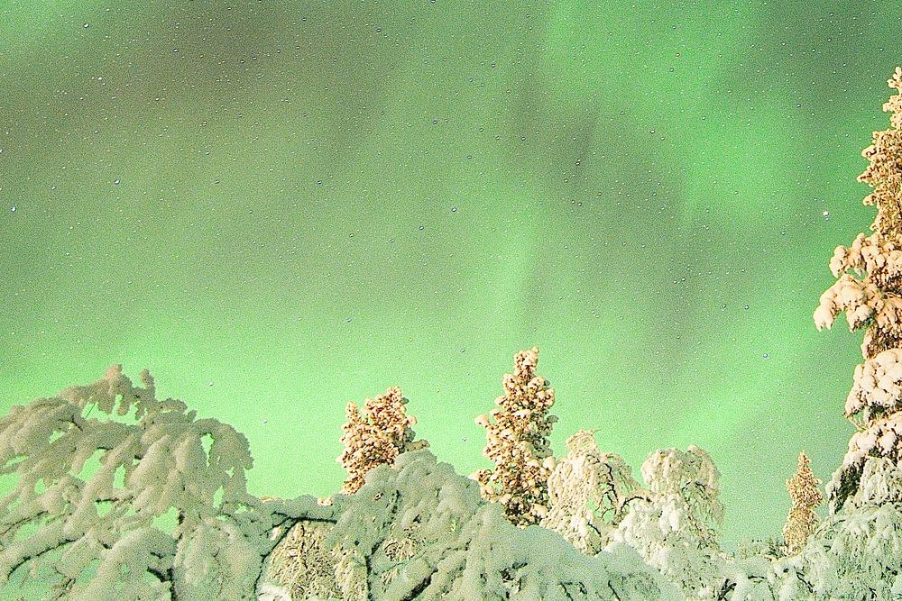 Verschneite Landschaft in Finnland während eines Polarlichtausbruchs.