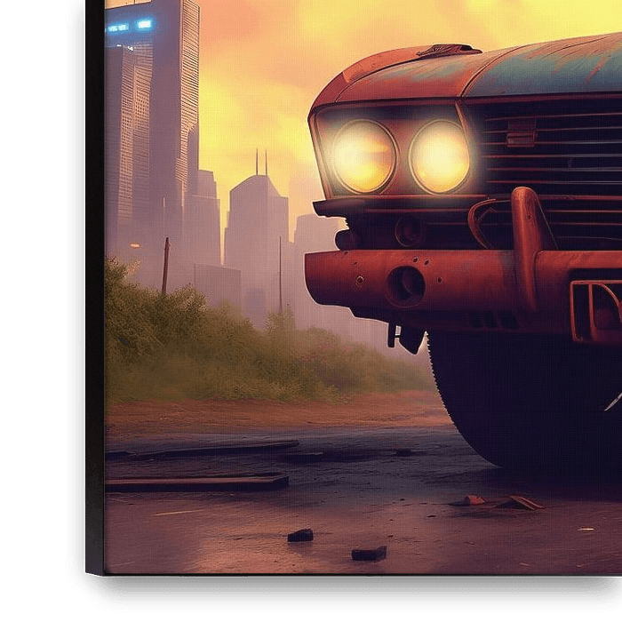 Altes grünes Auto auf einem verlassenen Parkplatz während eines nächtlichen Gewitters. Im Hintergrund eine große Weltstadt. Post-apokalyptische Szene.
