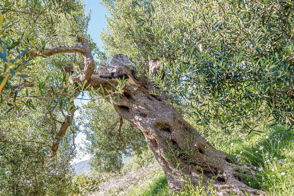 Weitwinkelaufnahme eines Olivenbaums in einem Olivenhain in Griechenland. Die Sonne scheint die Haut hinter dem Baum. Frisches, grünes Gras mit hellvioletten Blüten.
