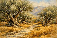 Ein ruhiges Ölgemälde eines jahrhundertealten Olivenhains im warmen mediterranen Morgenlicht. Knorrige, silbergrüne Olivenbäume mit gewundenen Stämmen werfen gefilterte Schatten auf goldgelbes Gras. Ein verwitterter Steinweg schlängelt sich durch den Olivenhain, während sanfte Berge in der Ferne verschwimmen. Die trockene Pinselführung…