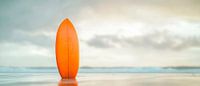 Ein strahlend orangefarbenes Surfbrett steht majestätisch am Strand, umgeben von sanften Wellen und einem himmelblauen Hintergrund. Dieser farbenfrohe Akzent bringt Lebensfreude und Abenteuer in jeden Raum. Perfekt für das Wohnzimmer oder eine Surf-Ecke, schafft es eine entspannte, sommerliche Atmosphäre, die zum Träumen einlädt.